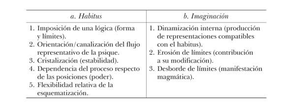 Podría insistirse, precisamente, por el sentido cabal de incorporar un concepto extraño a la lógica de otro (el habitus) que se ha mostrado tan útil en la investigación de campo. Una vez más hay que subrayar que no se trata de discutir la validez empírica del concepto, indudable dentro de sus fines, sino los supuestos teóricos que precisamente esa eficacia puede contribuir a oscurecer. El concepto de imaginación radical proporciona una clarificación de la materia prima a partir de la cual se desarrolla el habitus, destacando que no es una tabla rasa, y sobre todo que no permanece inerte ni deja de ser operante una vez que el habitus se ha constituido. El sentido en que representa un “complemento” respecto del habitus debe en tenderse exactamente en ese contexto: habitus e imaginación son componentes dialécticamente enlazados del ser humano actuante, que deben integrarse como tales en una teoría de la acción.