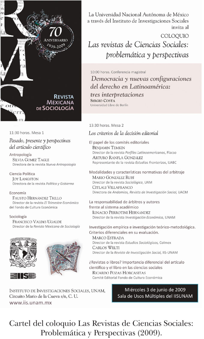 El presente texto fue expuesto en el coloquio Las Revistas de Ciencias Sociales: Problemática y Perspectivas, organizado por el doctor Francisco Valdés Ugalde, entonces director de la Revista Mexicana de Sociología (RMS), y promovido por la directora del Instituto de Investigaciones Sociales (IIS), la doctora Rosalba Casas Guerrero. Dicho coloquio se realizó para conmemorar el 70 aniversario de la fundación de la RMS.1