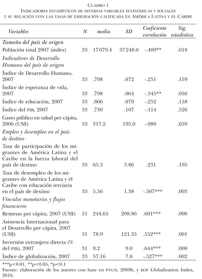 En el presente apartado se examinan y discuten un conjunto de procesos asociados con la migración de personas con altos niveles de escolaridad en América Latina y el Caribe. La idea es establecer el grado de asociación positiva o negativa de diversas variables económicas y sociales con la migración calificada, sin que ello signifique encontrar una relación de causalidad. Las variables analizadas aquí, en relación con la migración calificada, se organizan en cuatro grandes grupos: 1) Tamaño de la población del país de origen y tipo de región de origen; 2) Indicadores de desarrollo humano del país de origen; 3) Empleo y desempleo en el país de destino; 4) Vínculos monetarios, flujos financieros y nivel de inserción global de los países de origen. La estrategia metodológica desarrollada consiste, primero, en un análisis descriptivo de la relación (correlación) de un conjunto de variables económicas y sociales con las TEC de 33 países de América Latina y el Caribe hacia países de la OCDE. El segundo momento consiste en un análisis estadístico basado en regresiones lineales (OLS), con el fin de determinar los niveles de asociación de un conjunto de variables económicas y sociales con las tasas TEC de América Latina y el Caribe, análisis que pondrá especial énfasis en los indicadores de desarrollo humano de los países de origen. Las fuentes de información empleadas son: 1) La base de datos elaborada por Docquier, Lowell y Marfouk (2009) sobre el stock de migrantes internacionales de 25 años y más, residentes en los países de la OCDE, según nivel de escolaridad, para los años 1990 y 2000; con base en esta información se elaboraron estimaciones de la migración calificada con origen en América Latina y el Caribe para el año 2008; 2) El anexo estadístico del Informe sobre Desarrollo Humano de 2009 (PNUD, 2009b). Otros indicadores económicos y sociales fueron extraídos de la base del Banco Mundial (2010), del Anuario Estadístico 2009 de la Comisión Económica para América Latina y el Caribe (Cepal, 2010) y del Índice de Globalización (Dreher, 2006, y Dreher et al., 2008).