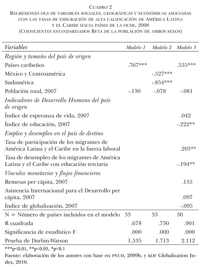 1. Un primer aspecto que es preciso hacer notar es la importancia de controlar este tipo de regresiones por región. Los resultados del modelo 1 indican que los países de la región caribeña presentan un coeficiente con signo positivo, mientras que las subregiones de Centroamérica (incluido México) y Sudamérica tienen signo negativo (ver modelo 2). En las gráficas 2 y 3 de este artículo se había observado que la región Caribe sobresalía por sus altas tasas de emigración calificada, y con los resultados de los modelos 1 y 2 es posible afirmar que el patrón de la migración calificada en América Latina y el Caribe tiene sus especificidades regionales.