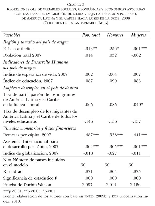 Con el propósito de realizar un análisis con mayor profundidad sobre la relación entre variables económicas y sociales asociadas con las tasas de emigración calificada, en esta sección se presentan los resultados de tres modelos de regresión lineal (OLS). La estrategia metodológica adoptada en el desarrollo de estos modelos consistió en ir incorporando variables dicotómicas relacionadas con tres grandes subregiones del continente (Caribe, Centroamérica —incluyendo México— y Sudamérica),8 junto con la variable tamaño de la población del país de origen (modelos 1 y 2). El modelo 3 fue seleccionado como el de mejor ajuste, que incluye, además de las variables de región y tamaño de la población del país de origen, otros indicadores sobre el desarrollo humano del país de origen, sobre el empleo y el desempleo en el país de destino y variables sobre vínculos monetarios y flujos financieros. Cabe señalar que en este último modelo no fueron incorporadas todas las variables comentadas en la sección anterior, ya sea por tener una fuerte correlación con otras sí incluidas, por no tener coeficientes significativos, o simplemente porque su inclusión afectaba negativamente el ajuste del modelo.