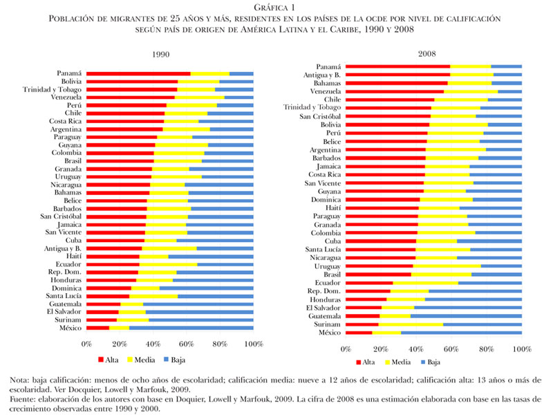 Asimismo, la participación de los migrantes calificados en la población migrante de 25 años y más, residente en algún país de la OCDE, aumentó considerablemente entre 1990 y 2008. Así, vemos cómo en 1990 los migrantes calificados constituían más de 40% del total de la población migrante en 12 de los 33 países de América Latina y el Caribe considerados en este trabajo; en tanto, en 2008 el número de países con más de 40% de migrantes calificados respecto al stock total aumentó a 22. Esto también habla de la especialización que algunos países han adquirido tanto en el envío de mano de obra de baja calificación (como se observa en los casos de México, Guatemala, El Salvador y Honduras) como en el envío de trabajadores calificados (los casos de Panamá, Antigua y Barbuda, Bahamas, Venezuela y Chile; ver gráfica 1).4