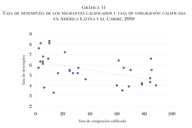 Respecto a los indicadores económicos sobre la demanda de trabajo migrante en los países receptores y sus niveles de desempleo, se encontró lo siguiente: la correlación con las tasas de participación de los migrantes de América Latina y el Caribe en la fuerza laboral de los países de destino (en este caso, países de la OCDE) manifiesta una pauta similar a la del tamaño de población —aunque en este caso no es estadísticamente significativa—; es decir, en los países con bajas TEC es clara la correlación negativa entre estas dos variables, situación inversa en países con altas TEC (véase la línea de tendencia en forma de “U” en la gráfica 10). Sin embargo, la correlación es negativa y altamente significativa cuando se relacionan las tasas de desempleo de los migrantes calificados de América Latina y el Caribe en los países de destino con las TEC, lo que indica que las menores tasas de desempleo de los migrantes calificados en los países de destino están asociadas con una mayor migración calificada, relación que es altamente significativa (ver cuadro 1 y gráfica 11). Es posible que el conocimiento del comportamiento del mercado laboral de destino actúe como un aliciente o detractor de mayores niveles de migración calificada.