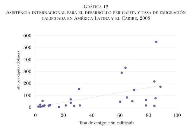 Otra de las variables consideradas en el campo de las interconexiones es la asistencia internacional para el desarrollo (AID). Al respecto, nuestros datos muestran que mayores montos per cápita de este flujo financiero se relacionan con tasas de emigración calificada también mayores. Si consideramos como punto de partida los postulados de organismos internacionales como el Banco Mundial o el Banco Interamericano de Desarrollo, la AID es considerada como uno de los instrumentos más efectivos para reducir la migración internacional. Sin embargo, algunas evidencias empíricas muestran que el crecimiento económico en muchos países no necesariamente se traduce en menores tasas de emigración; por el contrario, la emigración se incrementa debido a que los individuos pueden afrontar los costos y riesgos de un desplazamiento internacional. En su estudio sobre el impacto de la AID en la emigración internacional de 48 países subsaharianos, Belloc (2008) encuentra que aquélla tiene un efecto positivo en la decisión de emigrar, por dos razones: las nuevas oportunidades laborales y el incremento de los ingresos permiten cubrir los costos relacionados con la migración; y dado que la AID está fuertemente asociada con el impulso a programas de desarrollo en educación, servicios de comunicación y oportunidades para abrir negocios, esto podría estimular las aspiraciones de movilidad de los potenciales migrantes. En rigor, evidencias empíricas de esta naturaleza confirman el hecho de que la emigración internacional no es sólo resultado de la falta de desarrollo económico de los países emisores, sino que también el desarrollo económico estimula la migración. Este tipo de hallazgos dan cuenta, como se ha mencionado, de la compleja y recíproca relación que existe entre migración y desarrollo, así como de la necesidad de que tales resultados sean analizados en el contexto del desarrollo local o, en otras palabras, incrustados en el proceso de desarrollo social y económico más amplio del que forman parte (Haas, 2010).