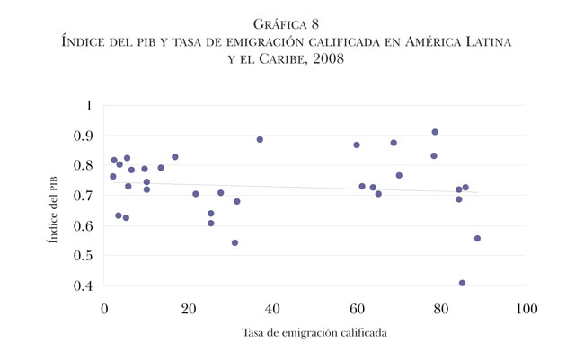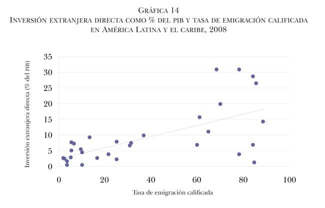 La correlación entre la inversión extranjera directa (IED) per cápita y las tasas de emigración calificada de América Latina y el Caribe muestra un efecto positivo y altamente significativo, resultado que confirma los hallazgos de otras investigaciones. Por ejemplo, Sanderson y Kentor (2008) encontraron que el flujo de IED hacia 25 países subdesarrollados tiene un efecto positivo de largo plazo en los niveles de emigración internacional. Los autores sugieren que los efectos de la IED en la emigración internacional pueden ser de corto y de largo plazo. Mientras que en el corto plazo la IED puede reducir la emigración desde países subdesarrollados, en virtud de que este flujo promueve la creación de empleos y expande las oportunidades del mercado laboral, el efecto de largo plazo puede ser exactamente el contrario, toda vez que la IED indirectamente contribuye a la reducción de las tasas de crecimiento económico de los países de origen, lo que reduce las oportunidades de empleo y presiona los niveles salariales hacia la baja. Held y asociados (2002) muestran la importante expansión que experimentaron los sistemas globales de producción y distribución, reflejados en el crecimiento de las corporaciones transnacionales y la consecuente IED que ellas realizan. En la década de los años noventa, prácticamente todas las economías del mundo formaban parte de las redes de producción global relacionadas con tales corporaciones, producto de la liberalización de sus reglamentaciones y de políticas activas de fomento a la inversión extranjera en sus territorios. El atractivo de los países en desarrollo como base para las corporaciones creció significativamente en las últimas tres décadas, mientras la gran mayoría de los flujos de IED siguen originándose en los países de la OCDE.7