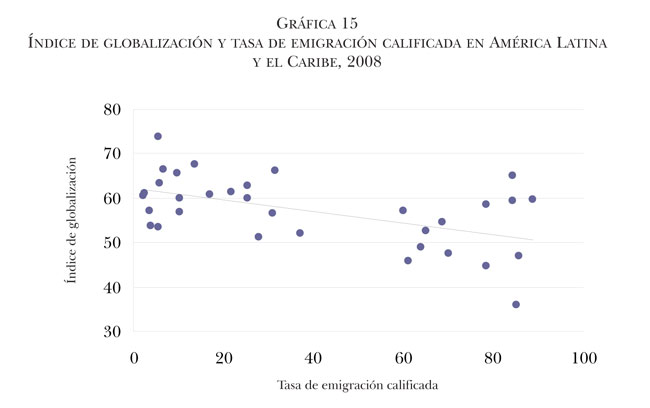 Una última variable considerada en esta sección es el índice de globalización (KOF), indicador que mide tres dimensiones de la globalización: la económica, la social y la política. El índice de globalización se compone de los siguientes subíndices: flujos comerciales, restricciones económicas, globalización social, contacto personal, flujos de información, proximidad cultural y globalización política (Dreher, 2006; Dreher, Gaston y Martens, 2008). Los resultados de la correlación entre este índice y las tasas de emigración calificada indican que niveles menores del índice de globalización se relacionan con altas tasas de emigración calificada. Autores que han estudiado la relación entre este índice y la migración internacional en países asiáticos (Moshfegh, Javad y Khuban, 2010) han encontrado que a medida que aumenta la globalización, las tasas de emigración disminuyen y las de inmigración aumentan, resultados que confirman nuestros hallazgos. Sin embargo, queda pendiente hacer algunas correlaciones entre los subíndices que componen el índice de globalización y las tasas de emigración calificada en el contexto latinoamericano, para poder desagregar esas relaciones y generar nuevas preguntas de investigación.
