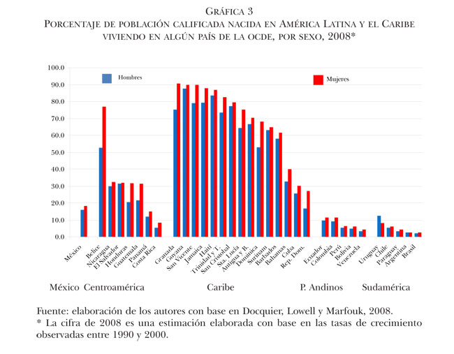 Por cuanto toca a la participación femenina en el contingente de trabajadores calificados, de los 33 países considerados, en el año 2008 únicamente dos países sudamericanos (Uruguay y Argentina) presentaron tasas de emigración calificada femenina menores que las masculinas (gráfica 3, p. 689). En los restantes 31 países, las tasas de emigración calificada femenina fueron superiores a las masculinas; sobresalen los casos de Belice, Granada, San Vicente, Jamaica, Santa Lucía y República Dominicana. La notable participación de mujeres en el contingente de migrantes calificados obliga a tomar en cuenta en este estudio las diferencias de género en el análisis de los efectos de esta migración en los países de origen.