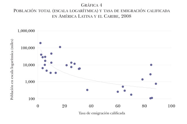 La región de América Latina y el Caribe comparte estas características y expresa algunas especificidades. La principal evidencia es la existencia de un gran dinamismo del movimiento internacional de recursos humanos calificados junto con una fuerte desigualdad en los niveles de emigración calificada de estos países. Si bien en años recientes América Latina y el Caribe se ha posicionado como la región con la tasa más alta de emigración calificada (TEC) hacia los países de la Organización para la Cooperación y el Desarrollo Económico (OCDE), esos niveles promedio esconden una gran diversidad: los niveles de emigración calificada de la subregión del Caribe son notoriamente altos, mientras que los de la mayoría de los países sudamericanos y andinos presentan tasas relativamente bajas. Este comportamiento encuentra correlato con lo evidenciado en diversos trabajos acerca de la relación entre tamaño de población y emigración de personas calificadas (Docquier y Marfouk, 2006; Docquier; Lohest y Marfouk, 2007; Docquier y Rapoport, 2007; Clemens, 2009; PNUD, 2009a).