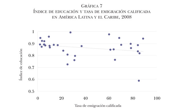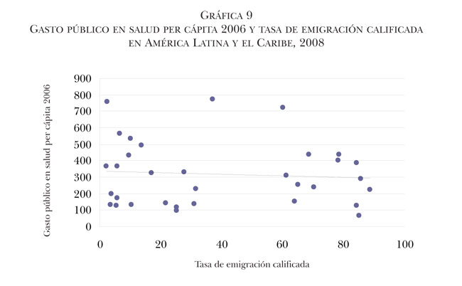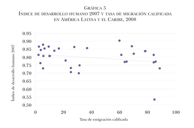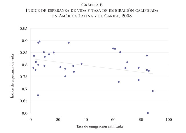 Respecto a los cinco indicadores sobre desarrollo humano en el país de origen (índice de desarrollo humano, índice de esperanza de vida, índice de educación, índice del PIB y gasto público en salud per cápita), todos presentan una correlación negativa con las tasas de emigración calificada, aunque únicamente en el caso del índice de esperanza de vida esa correlación es estadísticamente significativa. Este último resultado muestra que altas tasas de emigración calificada se asocian con índices más bajos de esperanza de vida en los países de América Latina y el Caribe, resultado contrario a lo propuesto en el Informe de Desarrollo Humano 2009, en el sentido en que la migración, en general, impacta positivamente la situación de la salud de la población de los países de origen. Sin embargo, utilizando los indicadores enunciados, no es posible afirmar que existe una relación clara y única entre los indicadores de desarrollo humano y las tasas de emigración calificada. Estos hallazgos al menos demandan cierta cautela en las interpretaciones —como las que hemos mencionado del Informe de Desarrollo Humano 2009—, en tanto no es posible generalizar las relaciones existentes entre diversas expresiones del desarrollo humano y la migración calificada. Aunque no todas las variables son significativas, todas presentan signos negativos (lo que resulta al menos sugerente para repensar las afirmaciones del mencionado informe).