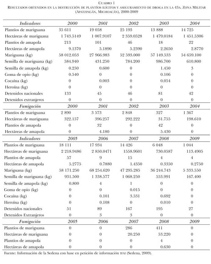 Como consecuencia, los territorios en donde se asienta el narcotráfico se amplían a la zona templada de Uruapan y gran parte de la sierra Jalmich. En el transcurso de los años setenta llega a esta zona la semilla de mariguana, que empieza a ser cultivada por unos cuantos de los más atrevidos, y su cultivo se expande al mismo tiempo que los desmontes para producir maíz se reducen (Barragán, 1997: 186-187). La zona templada de Uruapan se consolidó como la principal productora de aguacate para el mercado estadounidense y más tarde para el europeo. Se dice que se invirtieron grandes capitales ilegales en fincas aguacateras, pero también que gente de la Sierra se desplazó hacia esta zona para protegerse ante el aumento de la violencia.12 En síntesis, durante el boom de la droga en los años sesenta, el ejército destruyó 374 hectáreas de amapola y cerca de 200 hectáreas de mariguana, así como innumerables plantíos, además de la intercepción de droga en la región sur.13 Para los años setenta, las cifras oficiales señalan un porcentaje elevado de destrucción y aseguramiento de droga. Por ejemplo, se destruyeron trece millones y medio de plantas de amapola, más de treinta hectáreas y alrededor de dos mil plantíos de amapola, varios kilos de opio y heroína y casi una tonelada de semilla. En cuanto a la mariguana, se destruyó una y media toneladas lista para el consumo, quinientas cincuenta hectáreas cultivadas, aproximadamente quinientos plantíos y noventa y cinco toneladas de semilla, entre las cifras más importantes.14