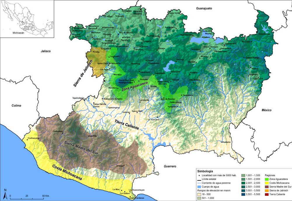 Finalmente, en tercer lugar, se encuentra la Costa michoacana, donde habitan pueblos nahuas en elevaciones de entre 500 y 700 msnm. Algunos pueblos indígenas, como Aquila, Pómaro, Coyre y Ostula, resistieron distintas invasiones rancheras, pero finalmente logró imponerse una mayoría mestiza (Gledhill, 2004, 1995). Durante el siglo XX, este territorio étnico fue objeto de disputas por el desplazamiento de los rancheros en terrenos comunales, comprando irregularmente la tierra o tomándola por la fuerza. Algunas comunidades indígenas se involucraron en el cultivo ilegal debido a los ciclos económicos o las coyunturas políticas, pero siempre con agudos conflictos agrarios con los mestizos al pretender privatizar la tierra, arrendarla para sembrar droga o realizar ellos mismos el cultivo. En los años ochenta se construye la carretera federal entre el puerto de Lázaro Cárdenas, Manzanillo e Ixtapa-Zihuatanejo, cubriendo gran parte de la costa del Pacífico, lo que provocó un aumento del tráfico de drogas por tierra, mar y cielo. Desde entonces ha habido violencia de manera ininterrumpida por la disputa de terrenos comunales y pequeñas propiedades en la Costa, debido a las presiones de grupos económicos legales e ilegales por apropiarse de extensiones territoriales para inversión turística, tráfico de droga y explotación minera, pero sobre todo para controlar los puertos marítimos.