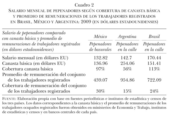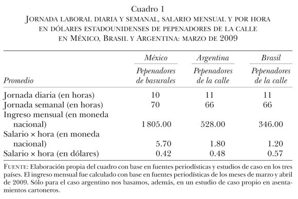 El pago por el material recolectado resulta ínfimo y también puede variar según la modalidad que se asuma. En general, la actividad de recuperación y venta comprende a toda la unidad familiar. En las tareas de selección y clasificación suelen participar tanto mujeres como niños. Por este motivo, el salario obtenido y declarado suele ser el único ingreso de toda la familia pepenadora. Cabe destacar que los precios de los materiales reciclables se encuentran sujetos a variaciones. Durante el 2009, la crisis económica influyó en esos precios, con una baja equivalente a 50% y hasta 80%. De este modo, los ingresos obtenidos disminuyeron sistemáticamente. Los cuadros 1 y 2 fueron construidos para ponderar el salario mensual de los recuperadores durante el 2009, tomando como fuente artículos periodísticos y estudios de caso en los tres países.