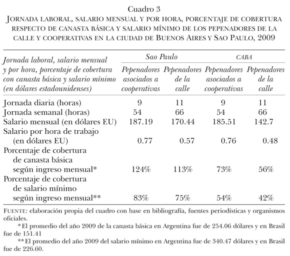 Este cuadro muestra que el salario mensual de los recuperadores de las cooperativas porteñas no alcanza a cubrir la canasta básica, mientras que el de los miembros de las asociaciones paulistas la supera en 24%. Si comparamos el salario de los pepenadores asociados con el salario mínimo estipulado oficialmente en cada país, observamos que en Sao Paulo se cubre el 83% y en la ciudad de Buenos Aires el 54%. Cabe destacar que en ambas ciudades las condiciones de trabajo en las cooperativas son más favorables que la actividad realizada en la calle. No sólo la jornada laboral diaria y semanal es menor, sino que los ingresos mensuales son mayores en 9% en el caso paulista y en 23% en la ciudad porteña.