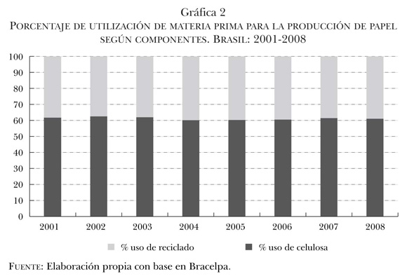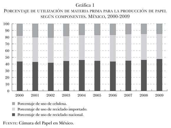 De los tres países estudiados, México es el que mayor cantidad de papel y cartón reciclado utiliza en la industria papelera. En el periodo 1984–1994 la producción de celulosa en México habría disminuido 57% debido a la utilización cada vez mayor de materiales reciclados, mientras que la producción de papel se habría incrementado en 23%. A su vez, la combinación de materias primas para la elaboración de papel era de 26% para fibras vírgenes y de 74% para el reciclado. A pesar de su uso intenso, la cámara de las empresas papeleras proponía incrementar la cantidad de pequeñas industrias dedicadas a la recuperación de materiales con el objetivo de potenciar el reciclado.24 Si comparamos las cifras correspondientes a 1994 con las de los años posteriores al 2000, observamos que el porcentaje de reciclado aumentó respecto al uso de celulosa. En este sentido, en 2006 se mantenía vigente la idea de incrementar el uso de reciclado en México, aunque se instaba a profundizar la recolección. De este modo, "los industriales de la celulosa y del papel [buscaban] impulsar una norma con la Secretaría del Medio Ambiente y Recursos Naturales (Semarnat) y la Secretaría de Economía (SE), para que por lo menos el 60% del papel que se utiliza en suelo mexicano se recolecte para ser reciclado", debido a que un porcentaje de esta materia prima se importaba de Estados Unidos.25 La gráfica 1 describe la evolución en los últimos 10 años de los diferentes componentes utilizados para la producción de papel en la industria mexicana.