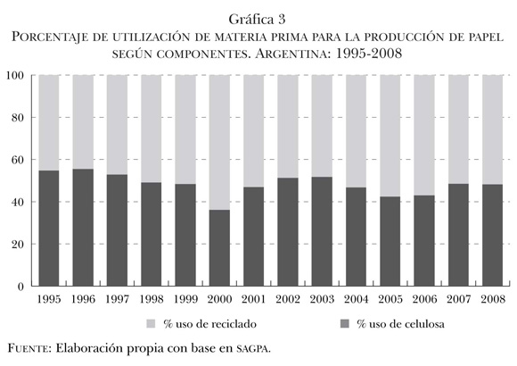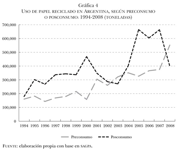 Cabe destacar que no todo el papel que se recicla proviene del trabajo de los recuperadores. Un porcentaje de este reciclado se denomina papel de preconsumo, y es el que procede de la misma empresa; son los restos de material que no salen al mercado, ya sea porque se trata de recortes para dar forma a las cajas de cartón o porque la calidad no alcanza las pautas requeridas. Por su parte, el papel que sí llega al mercado y luego es reutilizado, denominado papel de posconsumo, tampoco proviene totalmente de la actividad de los pepenadores. Existen convenios entre empresas papeleras y supermercados que proporcionan el papel de embalaje una vez que los productos envueltos en las cajas son puestos en exhibición. No disponemos de datos al respecto de estos tres países, puesto que las cámaras empresariales no suelen publicarlos, ni los institutos de estadísticas oficiales. Sólo poseemos información sobre la utilización de papel de preconsumo y posconsumo para el caso de Argentina. La gráfica 4 muestra la evolución de los últimos años: