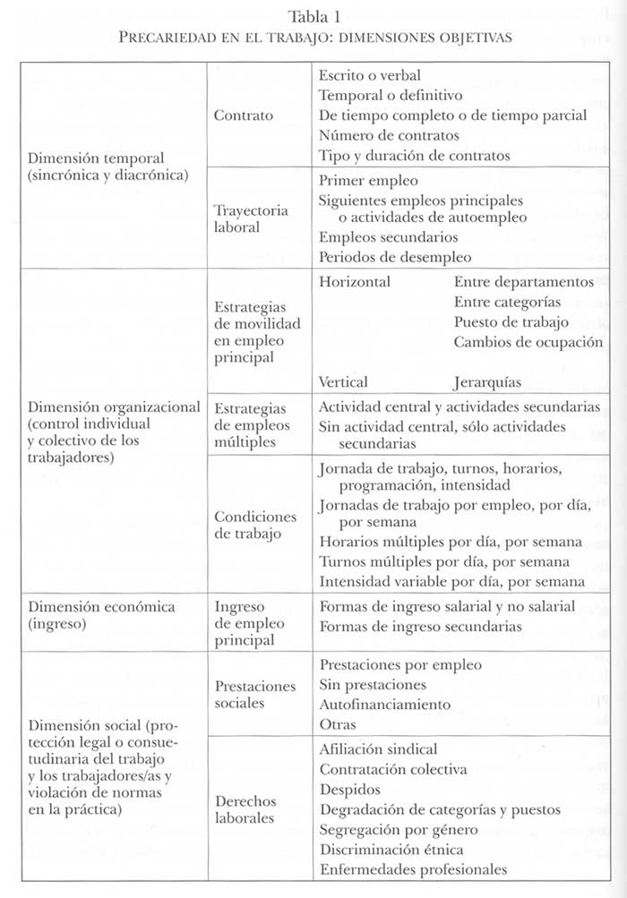 La tabla 1 resume las dimensiones objetivas de la precariedad en el trabajo, adaptadas principalmente de la propuesta de Rodgers y Rodgers (1989) y del proyecto ESOPE (2004).
