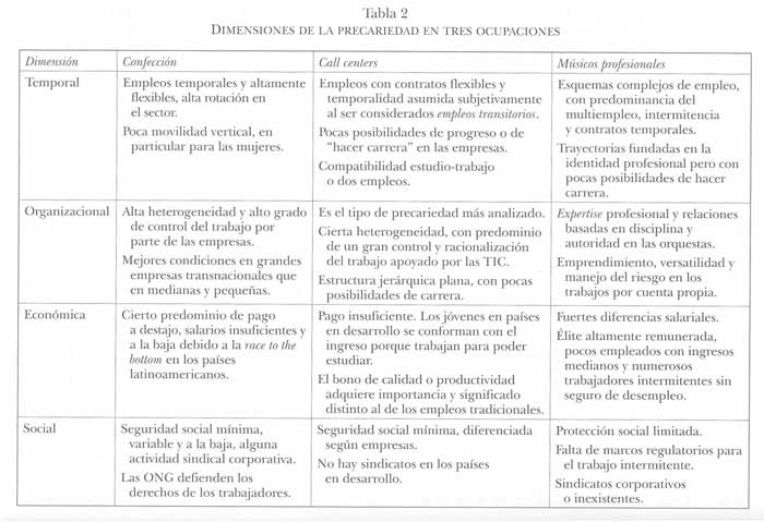 Palabras clave: precariedad laboral, heterogeneidad ocupacional, industria de la confección, call centers, músicos.