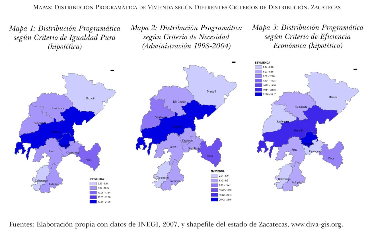 Los mapas 1, 2 y 3 representan las distribuciones geográficas programáticas de los beneficios de la política de vivienda en el estado de Zacatecas de acuerdo con los tres criterios de distribución considerados en este trabajo: igualdad pura, necesidad y eficiencia económica. Los mapas indican qué porcentaje del total del gasto en vivienda debe ser asignado a cada región.