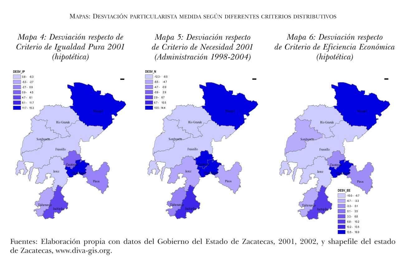 Si el criterio de distribución es igualdad pura, de acuerdo con su población, las regiones que más recursos deberían recibir son Fresnillo y Zacatecas, seguidas de la región de Pinos (mapa 1). Fresnillo, Zacatecas y Pinos tienen el 21%, el 19% y el 12% de la población del estado, respectivamente. Si, en cambio, el criterio privilegiado es necesidad, la región por priorizar es Fresnillo, seguida de Pinos y Sombrerete (mapa 2). Según este criterio, a Fresnillo le correspondería el 24% de los recursos, a Pinos el 16% y a Sombrerete el 11%. Por último, si el criterio propuesto fuera eficiencia económica, las regiones prioritarias en la distribución programática serían Zacatecas primero y en segundo término Fresnillo (mapa 3). Diferentes criterios de distribución prescriben distribuciones de recursos que privilegian y relegan diferentes regiones según su población, sus necesidades o el dinamismo de su economía.