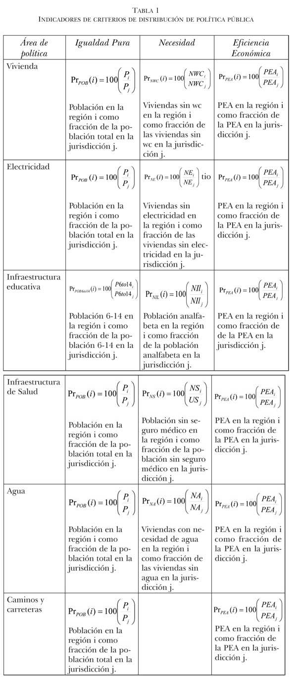 1) recursos limitados para ofrecer estos servicios, y 2) una cierta distribución de la población, de la fuerza de trabajo y de las necesidades a través del territorio de la jurisdicción. Dados estos constreñimientos distributivos, cualquier asignación de recursos a una región tiene lugar a expensas de las asignaciones a los demás. Por tal razón, los indicadores de igualdad pura, necesidad y eficiencia económica para cada región son medidos como fracciones con respecto al total de la jurisdicción. La medición de los indicadores como fracciones evita las distorsiones de las medidas per cápita cuando no son tomadas con referencia a la población relevante y cuando prevalecen asimetrías y desigualdades en el interior de la jurisdicción. La tabla 1 resume los indicadores propuestos para los criterios distributivos en cada área de política.
