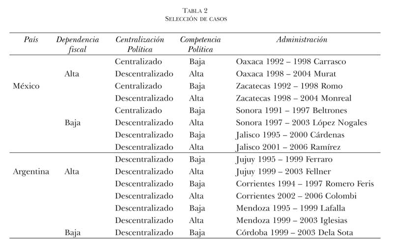 Para medir el nivel de competencia política se utiliza el margen de victoria en elecciones de gobernador. Los casos incluidos permiten explorar el nivel de particularismo en contextos que varían en cuanto a su centralización política, dependencia fiscal y competencia política. La tabla 2 presenta las administraciones incluidas en este estudio.