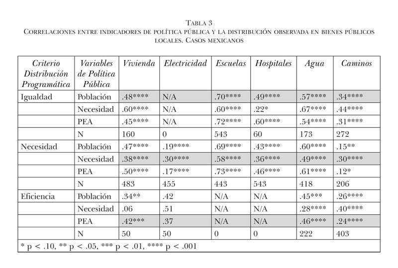 La primera fila presenta el coeficiente de correlación del tamaño de la población —indicador del criterio de igualdad— y la distribución observada de beneficios en cada una de las áreas de política pública (vivienda, electricidad, escuelas, hospitales, agua y caminos). En las siguientes dos filas se presentan los coeficientes de correlación de la distribución observada del gasto con los indicadores de los otros dos criterios, necesidad y eficiencia económica.