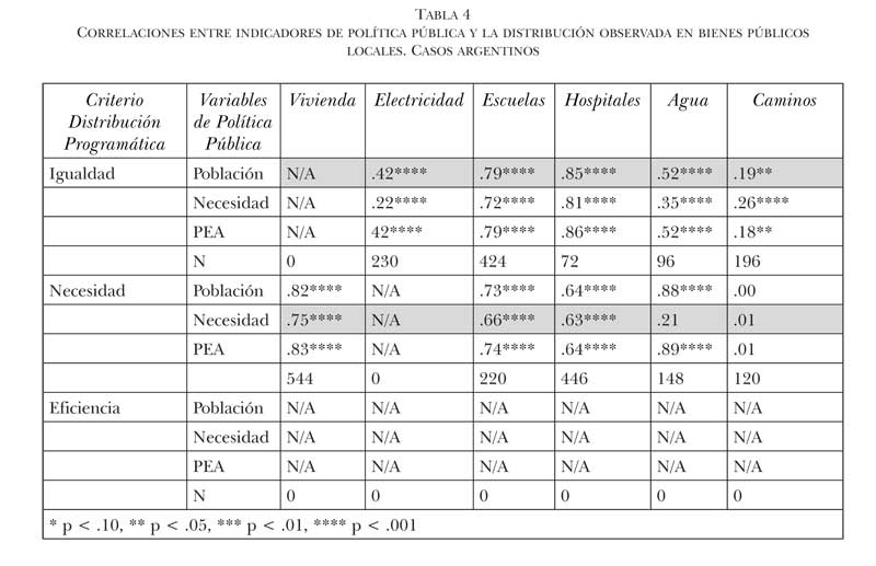 Entre los casos argentinos encontramos resultados similares. Por ejemplo, en la primera columna de la tabla 4, los tres coeficientes miden la correlación entre los tres indicadores de política pública y la distribución observada de beneficios de vivienda en administraciones cuyo criterio distributivo programático es necesidad, que concentra la totalidad de los casos. El coeficiente correspondiente a población, de .82, y la población económicamente activa, de .83, son mayores que el correspondiente al indicador de necesidad (.75), que regularía la distribución programática en todos estos casos. Al igual que en los casos mexicanos, en el área de la política de vivienda, las administraciones que proponen la distribución de los beneficios de esta política de acuerdo con las necesidades de la población se desvían de su programa y asignan los recursos privilegiando las regiones más productivas y más pobladas. De forma tal que si la oferta de vivienda fuera evaluada considerando los criterios alternativos de igualdad o eficiencia, podríamos subestimar el nivel de particularismo de estos gobernantes. En resumen, los criterios de política pública que se contemplen en la evaluación del particularismo en el gasto afectan su estimación, y si son seleccionados arbitrariamente las medias corren el riesgo de estar sesgadas.