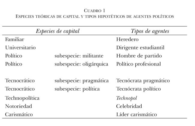 No cabe duda de que Bourdieu legó una poderosa teoría sociológica sobre los capitales de los que disponen los individuos; esto es, recursos que pueden tener valor dependiendo de las propiedades históricas de los campos y de lo que allí se encuentra en juego, a condición de que los agentes estén dotados de ese sistema de disposiciones que el autor llamaba habitus. Es sobre estas bases teóricas y conceptuales que resulta posible construir una teoría general del capital político, lo que supone, en este caso, especificar las distintas especies pertinentes para los agentes, un ejercicio que fue emprendido a partir del desglose de buena parte de la literatura sobre élites políticas en cinco países (para una síntesis, véase Joignant, 2011c).