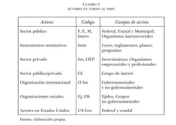 En la realización del proyecto del PMPC interviene un complejo de actores de origen vario. De inicio, se reconocen dos grandes grupos de intereses: quienes promueven la iniciativa y quienes se oponen a ella. Los actores se adscriben a los sectores público (federal, estatal y municipal), privado (inversionistas y organismos empresariales y profesionales), social (residentes de la RC) y ambiental (organizaciones de la sociedad civil). La naturaleza del proyecto sugiere que, como entidades favorecedoras del PMPC, inversionistas y representantes del gobierno federal ocupen papeles principales en el análisis, dejando posiciones de menor influencia a representantes estatales y municipales. La relevancia del sector privado descansa en su poder económico, mientras que la de la autoridad federal, en la propia jerarquía de la estructura política y administrativa. Por otro lado, las comunidades locales definirían su posición respecto al proyecto en función de los beneficios o perjuicios percibidos. En su oportunidad, los sectores proambientales representarían el rechazo al proyecto en tanto éste carezca de una visión de sustentabilidad que promueva la protección y conservación de los recursos naturales.
