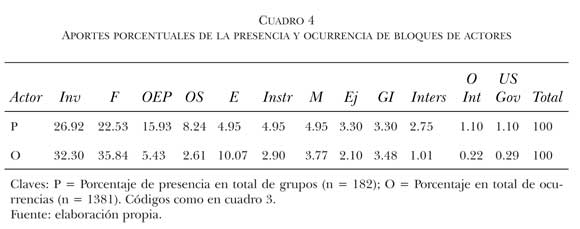 b) Actores. En el análisis se determinaron 182 grupos específicos de actores, adscritos a los sectores público y privado, así como a otras instancias. Se incluye también al conjunto de instrumentos (normatividad, planes, programas) que orientan el proceso del proyecto. Se concentran en 12 grandes grupos o "bloques", como se muestra en el cuadro 3. Del sector público, por ejemplo, se enumeran actores en bloques Federal, Estatal y Municipal, así como Intersectorial; similarmente, del sector privado se contabilizaron los bloques Inversionistas y Organismos Empresariales y Profesionales. La importancia relativa de esos bloques en el periodo se muestra en el cuadro 4, en modalidades de aporte de presencia e importancia relativa.