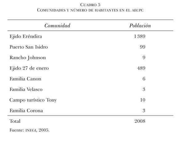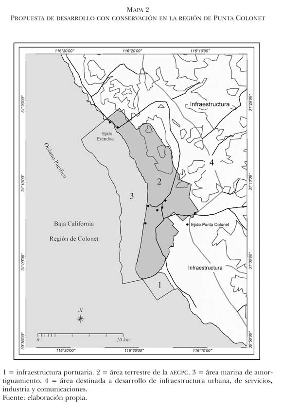 En la presunción de que el proyecto portuario se torne en realidad, aquí se aporta información para generar un escenario de conservación de recursos naturales en el que se minimicen los conflictos de intereses entre la creación de infraestructura para el crecimiento económico y la sustentabilidad del ecosistema. En este sentido, se propone crear en el interior de la RC un Área Esencial para la Conservación de Punta Colonet (AECPC), la que se localiza entre las latitudes máxima 31°18'55.82" N y mínima 30°56'42.45" N, y longitudes máxima 116°28'13.08" W y mínima 116°11'03.73". Se trata de un polígono irregular de 543.97 km2, con un perímetro de 122.55 km. La porción terrestre cubre una extensión de 310.28 km2 y la porción marina 233.69 km2, con un largo de costa de 60 km que se extiende desde el sur de Punta San Isidro al norte hasta el este de Cabo Colonet en el sur. El polígono está delimitado en la parte terrestre por los ejidos 27 de Enero, Eréndira e Ignacio López Rayón, y en la parte marina por la isobata de 200 m (mapa 2). En el AECPC se localizan ocho núcleos de población que totalizan alrededor de 2 000 habitantes (cuadro 5).