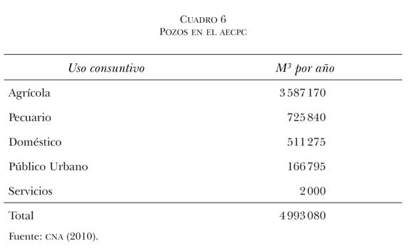 La tenencia de la tierra está dividida en propiedad privada, ejidal, y zona federal. La propiedad ejidal está fraccionada en los ejidos 27 de Enero, I. López Rayón y Eréndira, que ocupan 91% del área total; el 9% restante son terrenos urbanos, federales o propiedad privada. Dentro de los usos del suelo, el de mayor importancia por la extensión que ocupa es el dedicado a la agricultura, seguido del destinado a asentamientos urbanos. En el área se tienen declarados 39 pozos, con cinco usos consuntivos que representan un total de 4.9 millones de metros cúbicos de extracción anual y un gasto máximo de 697 m3 por segundo (cuadro 6).