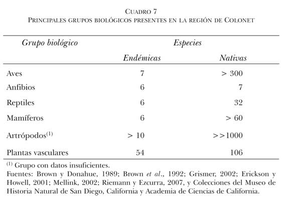 Por la riqueza de especies vegetales endémicas que allí se localizan, la RC ha sido identificada por Hugo Riemann y Exequiel Ezcurra (2005, 2007) como prioritaria para la conservación. Se han colectado 177 especies pertenecientes a 59 familias, de las cuales 110 son nativas de amplia distribución, 59 son endémicas, seis casi endémicas con poblaciones en el sur de California y ocho son exóticas. El 36% de la flora regional tiene carácter endémico, lo que confirma la relevancia del lugar como zona de alta riqueza y endemicidad. Los anfibios constituyen otro grupo sensible para la conservación por su estatus de riesgo a nivel mundial; en la RC se cuenta con no menos de siete especies (cuadro 7).