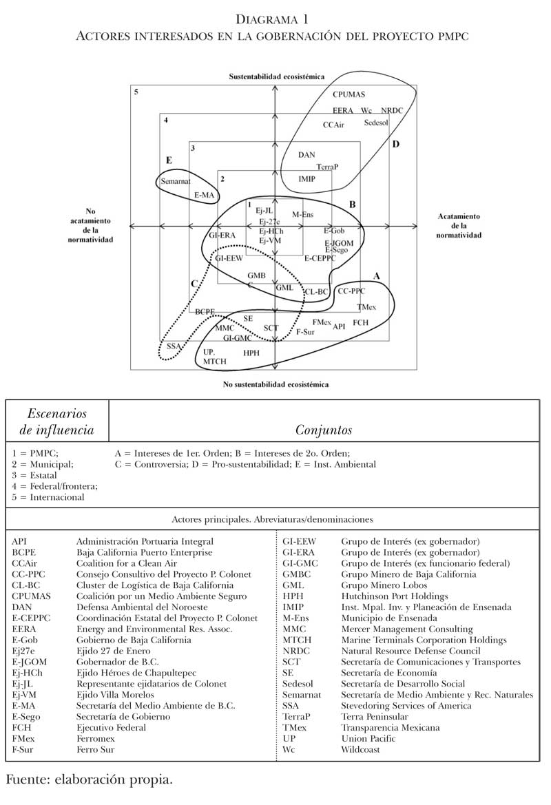c) Estado de la gobernación en torno al PMCP. En el diagrama 1 conceptual inspirado en el trabajo de Ludger Brenner (2010), que ilustra lo que denominamos estado de la gobernación en el proyecto del PMPC. Con fines analíticos, se destaca la presencia de los actores principales entre los 182 grupos específicos. El arreglo de los actores en ejes de coordenadas, que en la horizontal se distribuyen en el espectro No Acatamiento-Acatamiento de la Normatividad, y en la vertical en el espectro No Sustentabilidad-Sustentabilidad Ecosistémica, revela cinco conjuntos de intereses: 1er. orden, 2o. orden, Controversia, Pro-sustentabilidad, e Institución Ambiental.