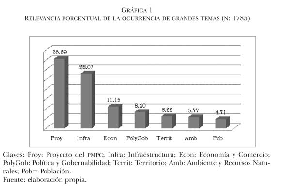 Los grandes temas se representan en la gráfica 1, de acuerdo con su importancia relativa en un total de 1785 ocurrencias. Las características de Proyecto del puerto e Infraestructura (referentes de los objetivos de construcción del PMPC) ocupan más de 60%, mientras que las de Ambiente y Recursos Naturales y Población (que se adscriben a los objetivos de sustentabilidad ecosistémica) ocupan las posiciones menos relevantes, con una representatividad conjunta de poco más de 10%.