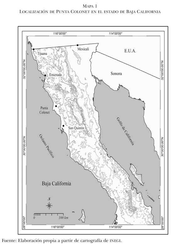 La Región Colonet (RC) está integrada por las delegaciones de Santo Tomás, Eréndira, San Vicente y Punta Colonet, todas en el municipio de Ensenada, Baja California. Se encuentra a poco más de 100 km al sur de la cabecera municipal (mapa 1), abarca una superficie de 4 058.97 km2, y concentra alrededor de 16 200 habitantes, quienes desarrollan actividades económicas de agricultura de riego, ganadería, pesca ribereña, aprovechamiento de recursos pétreos, y turismo (CICESE, 2007; DAN, 2008: 2; IMIP, 2008: 60, 106-107).