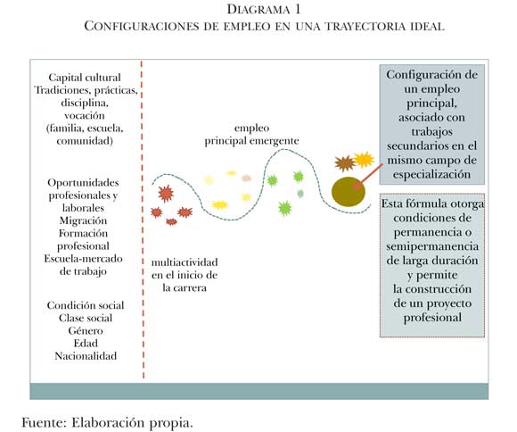 La multiactividad constituye una dimensión que se modifica a lo largo del tiempo bajo distintas circunstancias históricas, estructurales y biográficas. En este sentido, las modalidades del empleo de los músicos consideradas en un punto del tiempo, tal como se mostró arriba, deben analizarse como la consecuencia de factores macro y micro estructurales (familia, escuela, mercado) puestas en tensión por los propios individuos. Esta concatenación entre estructura y acción, entre los límites objetivos del mercado, las condiciones de clase (tradiciones familiares, educación e ingreso) y la capacidad de agencia de los individuos, es lo que intentaremos mostrar a través de las trayectorias de los músicos. Nuestra atención se enfocará en la forma y la dinámica de las trayectorias de los músicos que alcanzan la estabilidad en el empleo; de los que se quedan a medio camino, y de los que viven en la intermitencia y el multiempleo. Por último, buscaremos conocer desde el nivel biográfico los factores que explican estas distintas carreras laborales de los músicos.