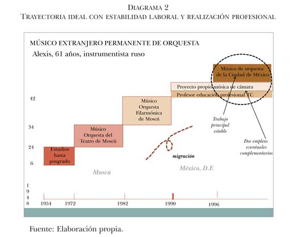 A partir de su inserción formal en el mercado de trabajo musical, las trayectorias laborales de ambos fueron continuas y exclusivas en el campo de la música. En el caso de Alexis, su carrera orquestal fue interrumpida al migrar a México. Pasados seis años en los que se dedicó preferentemente a la docencia, logró estabilizar su situación con un trabajo entre los mejores escaños de una orquesta de la Ciudad de México. No obstante, él vive este logro como una pérdida en comparación con las metas que se había propuesto en su situación anterior, y se conforma con su trabajo como profesor, en el que tampoco encuentra las condiciones adecuadas para sentirse completamente satisfecho. Este músico, que en términos objetivos pertenece a la élite musical del escenario clásico mexicano, expresa así su frustración:
