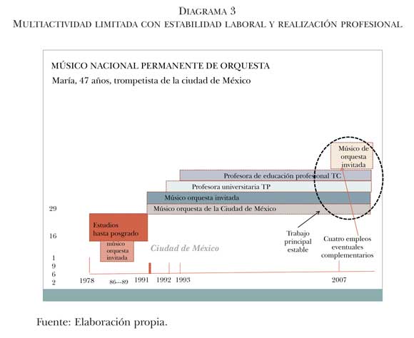 Instrumentista de 36 años, en los últimos años de sus estudios profesionales ingresó en el medio de las orquestas como músico invitado. Una vez titulado, no pasó mucho tiempo para que obtuviera una plaza como músico principal de esta orquesta. Desde hace más de 10 años éste es su empleo principal, aunque apenas hace dos firmó un contrato por tiempo determinado que le otorga los beneficios sociales mínimos. Ésta es la razón por la que permanentemente tiene otros empleos como maestro en colegios públicos y privados y se dedica a la promoción artística, el desarrollo de proyectos propios de música popular, la coordinación de proyectos de educación musical en poblaciones marginadas y la participación en eventos sociales. La multiactividad en estos casos es una estrategia preventiva para enfrentar la incertidumbre laboral, que puede prolongarse de por vida, y que según él le da un margen de libertad para desarrollar otros proyectos que lo gratifican profesionalmente, y le permite seguir estudiando con sus propios recursos.