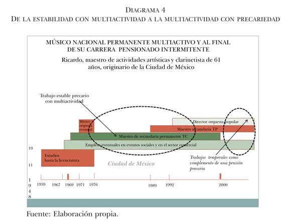 2. Trayectorias con estabilidad precaria y empleos secundarios de subsistencia. Es el caso de los maestros de educación básica y media, con permanencia prolongada en el empleo principal, pero con multiactividad y precariedad económica (por ingresos) a lo largo de su vida activa, y durante la jubilación. Este modelo de empleo muestra que la estabilidad contractual no asegura el bienestar económico y social de los músicos ni la realización profesional.