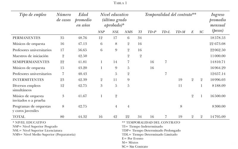 Una característica del empleo de los músicos de concierto es que la mayoría son profesionales, aunque es claro que a mayor inestabilidad en el empleo, el nivel educativo baja.