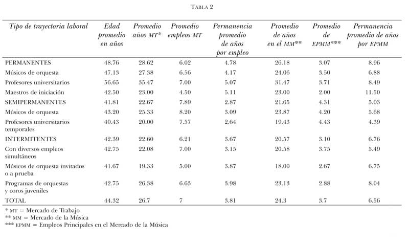 Si analizamos estos datos considerando la tipología de empleo de la tabla 1, observaremos que la mayor longitud de las trayectorias musicales está relacionada con la mayor estabilidad en el empleo y la edad de los músicos permanentes (véase tabla 2). A la cabeza de estos músicos, los de mayor edad, con 57 años de edad promedio, carreras largas con 32 años promedio en la música y permanencia promedio en los empleos de este sector de casi nueve años, están los 17 profesores de las universidades de mayor prestigio de la capital del país, de los cuales sólo seis son mujeres. Dos de ellas, jubiladas y recontratadas, forman parte de una generación en extinción, de profesoras "de toda la vida", con sólo cuatro y seis empleos en su prolongada carrera, que suman alrededor de 60 años. Estas figuras decimonónicas que gozaron de prestigio y reconocimiento por su entrega en cuerpo y alma a la enseñanza, con las que se formaron muchos de los actuales concertistas, hoy en día han sido sustituidas por unos pocos maestros privilegiados de tiempo completo y la numerosa base de profesores precarios de asignatura.