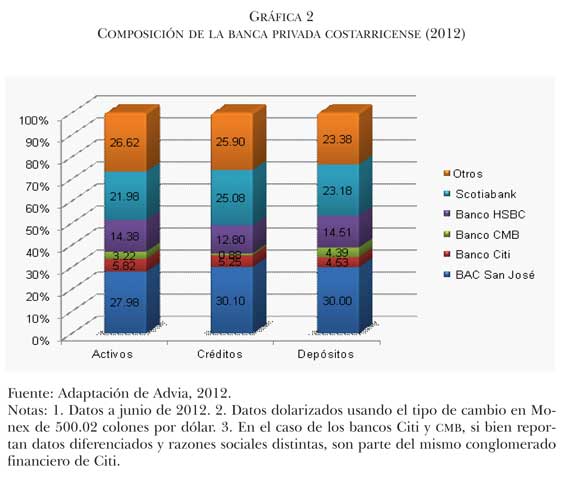 Con respecto a la banca privada, los niveles de concentración en activos, créditos y depósitos es muy alta, pues ésta se concentra en tres bancos. En conjunto, el BAC, Scotiabank y HSBC centralizan en activos 64.34% del total de la banca privada, mientras que en los créditos y depósitos del total de la banca privada, estos bancos concentran 67.97% y 69%, respectivamente. En este sentido, se debe señalar que Scotiabank y HSBC son "descendientes" de dos de los principales bancos de capital costarricense a finales de los noventa y la década pasada, a saber, Interfin y Banex. Por su parte, el BAC es un banco con presencia desde la década de los ochenta.