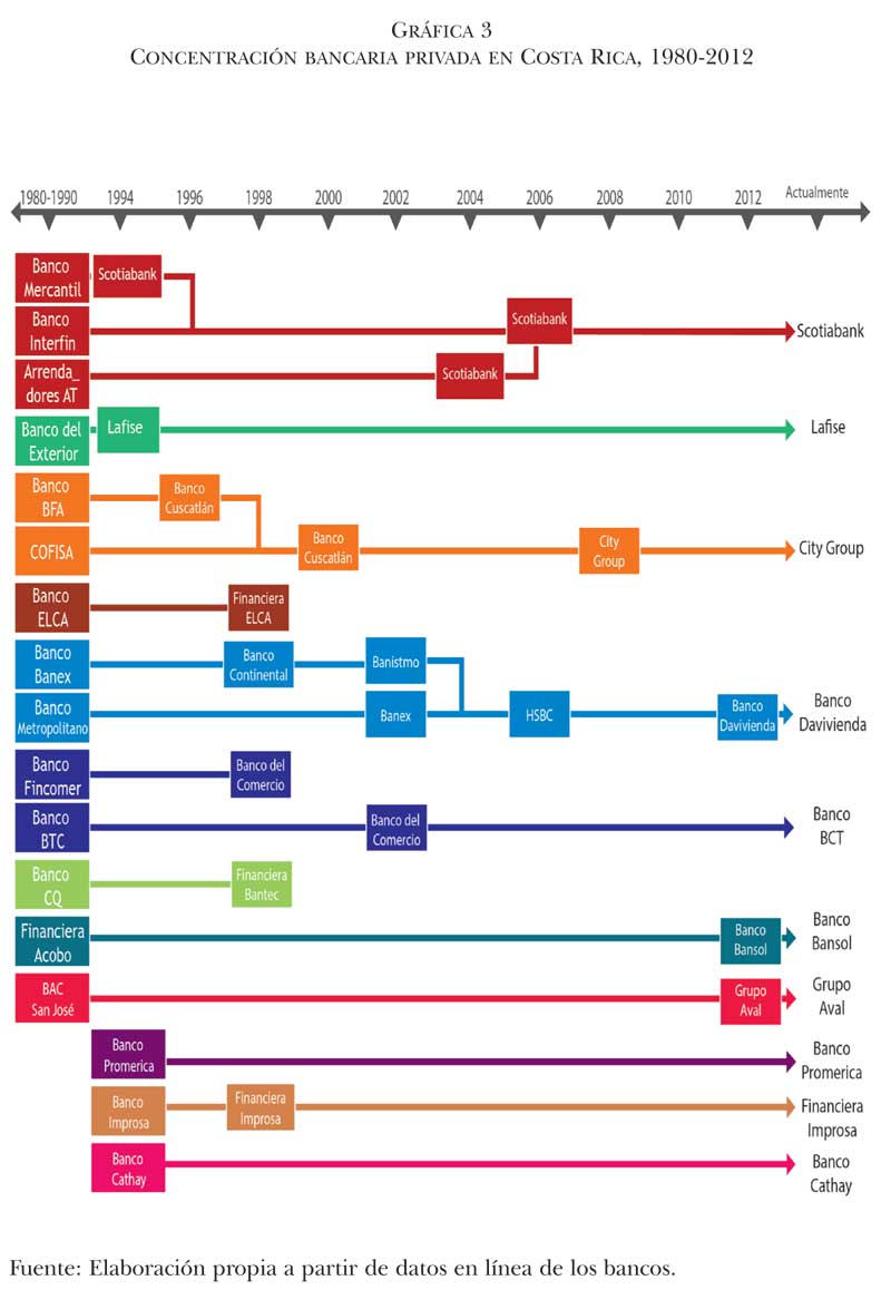 En el caso del sector financiero costarricense, como se pudo comprobar, esta apertura y liberalización —que ha tenido diversas etapas, de acuerdo con los propios ciclos del capitalismo— ha favorecido una mayor concentración del capital privado en manos de conglomerados regionales y transnacionales. No obstante, esto no ha detenido nuevos emprendimientos bancarios por parte del capital costarricense.
