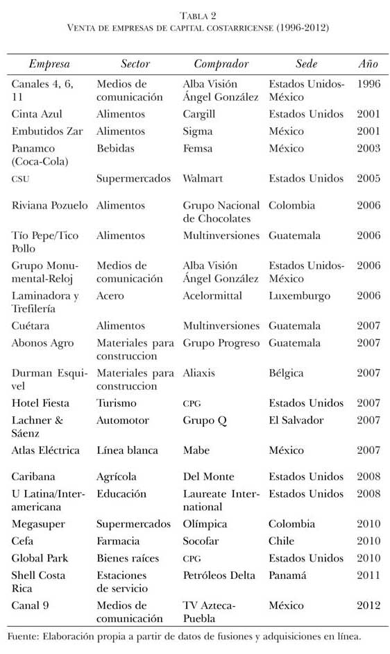 Del número de empresas vendidas en Costa Rica, incluyendo los canales de televisión 4, 6 y 11, a partir de 1996, ocho empresas han sido vendidas a empresas de capital estadounidense,18 cuatro a capital mexicano, tres a capital guatemalteco y dos a capital colombiano. A la vez, grupos en Panamá, El Salvador, Luxemburgo, Chile y Bélgica adquirieron una empresa cada uno (tabla 2).