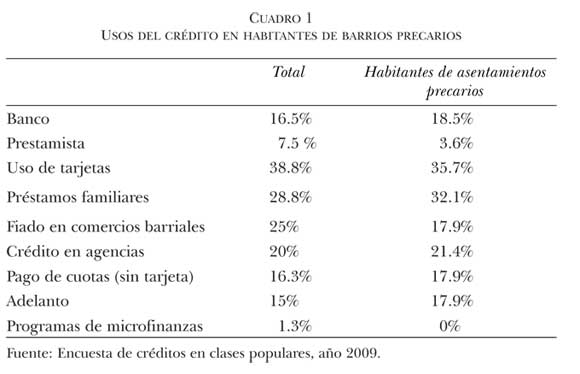 La heterogeneidad de las prácticas del crédito, por lo tanto, se confronta con la tesis que da preponderancia a las redes de reciprocidad no mercantil como fuente de dinero. Para los habitantes de asentamientos informales y villas miserias, el financiamiento puede provenir de ayudas familiares o el fiado en almacenes, pero también de productos de la expansión del mercado del crédito, como las tarjetas de crédito y los préstamos de agencias financieras. A estos créditos, que requieren menos requisitos formales que los bancos y cobran intereses más elevados, recurre 21.4% de los habitantes de asentamientos y villas encuestados (1.4% arriba del total).12