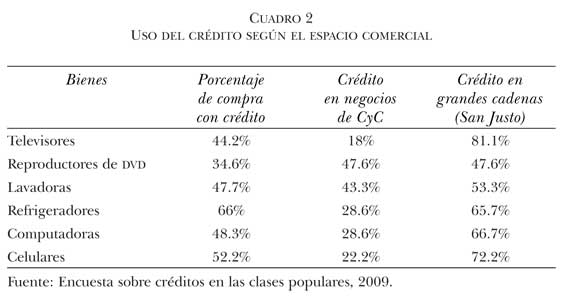 Esta integración desigual de los instrumentos crediticios se expresaba en el porcentaje que representan del total de las ventas. Según las entrevistas a los comerciantes de San Justo, entre 30% y 40% se generaba con algún instrumento de crédito. En CyC, este porcentaje era mínimo. El cuadro 2 muestra que el crédito se usa más cuando los productos se compran en grandes cadenas comerciales y disminuye de manera sensible cuando son adquiridos en comercios no asociados con ellas, como los de la zona de CyC.