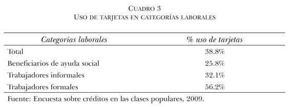 En tercer lugar, esa expansión implicó que nuevos sectores sociales se incorporasen al uso de instrumentos financieros formales. Esta tendencia no sólo permitió que la clase media empobrecida durante la década de los años noventa, y golpeada aún más durante la crisis de 2001, recuperase capacidad de consumo, sino que también logró transformar a las clases bajas en sujetos de crédito, conformando un mercado más amplio y heterogéneo que el antes predominante.