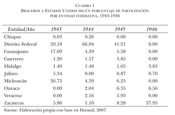Los diferentes tiempos sociales entre Oaxaca y Chiapas también se constatan en la participación diferenciada de ambas entidades en el Programa Bracero. De acuerdo con el cuadro 1, se puede apreciar que Chiapas es el estado de menor participación entre los 10 incluidos.