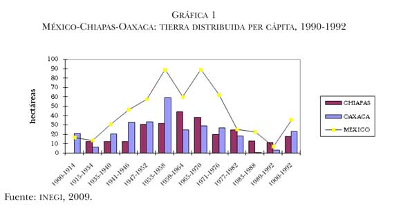 Después, una vez que la tierra en Oaxaca se había repartido casi toda, el reparto disminuyó (con excepción de 1971-1976); en cambio, aumentó en Chiapas.